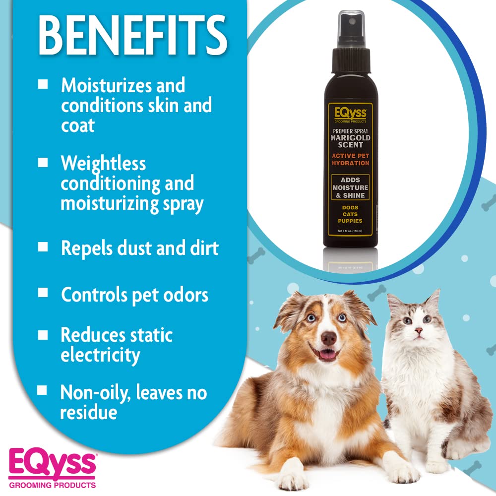 - Moisturize Pet's Skin & Hair: EQyss Premier Marigold Pet Spray was developed specifically to attract and bind moisture captured from the air to your pet's skin and coat for a boost of intense moisture and rehydration. The residue-free finishing spray conditions, moisturizes, and adds volume to the coat, repels dust and dirt, and instantly soothes dry skin!